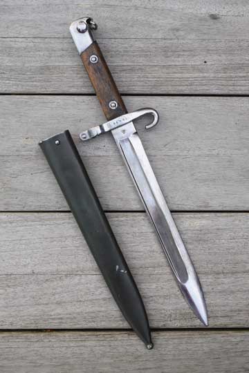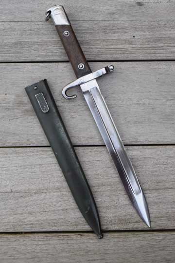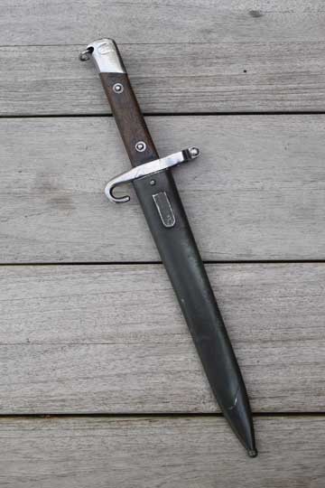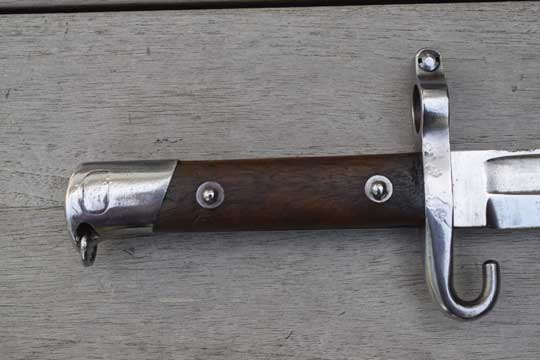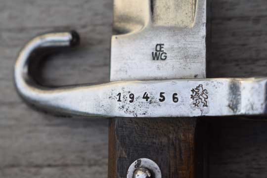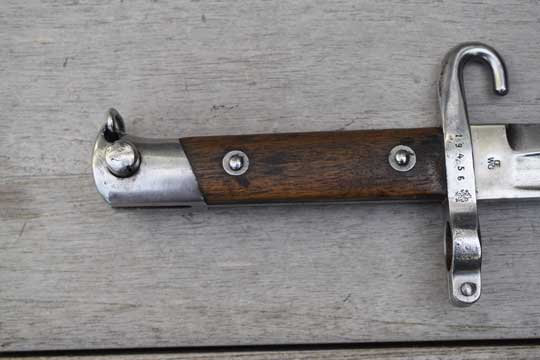 Austrian Mannlicher rifle M 1888 Kal. 8 mm. NCO bayonet. Bulgarian 5 digits serial number: 19456 followed by a crisp rampant Bulgarian lion on the crossguard. Excellent+ bright finished fullered blade. Cutting edge downwards. Ricasso is marked with the Austrian makers trademark: OEWG. Excellent bright finished pommel with lanyard loop and a bright finished crossguard with muzzle ring MRD 16.5 mm. NCO hooked quillon. Fastener on the top of the pommel. Excellent+ wooden grips riveted to the blade tang.