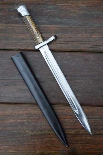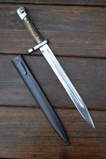 Mannlicher rifle M 1895 Kal. 8 x 50R. Excellent bright finished fullered reversed blade with Austrian makers logo: O.E.W.G on ricasso. Very good bright finished pommel and crossguard with muzzle ring MRD 15 mm. Crossguard rivets are filed flush. Excellent stag horn grips pinned to the blade tang by two brass pins. Excellent blackened steel scabbard marked with makers trade mark: MD in an oval. (=Moravske Ocelarny = Moravian Steelwork). No dents to the scabbard.