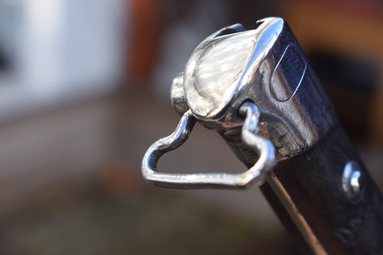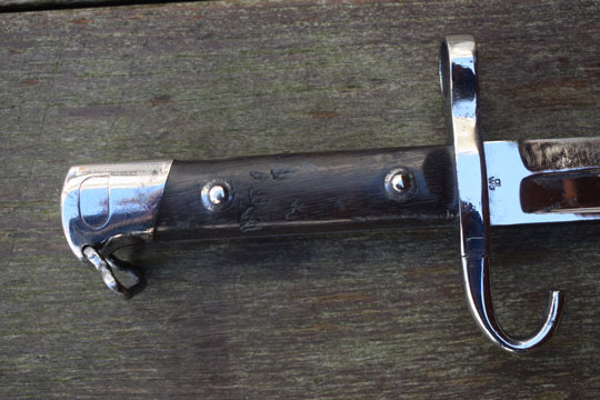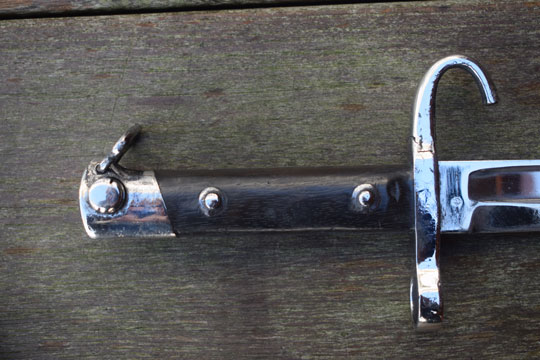 This is a standard M 1895 Mannlicher infantry bayonet converted to a NCO model by adding a lanyard loop and, very well done, a hooked guillon.