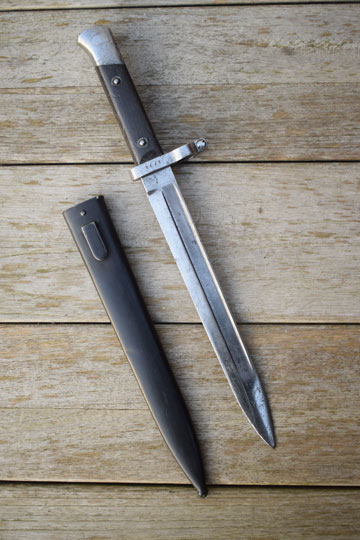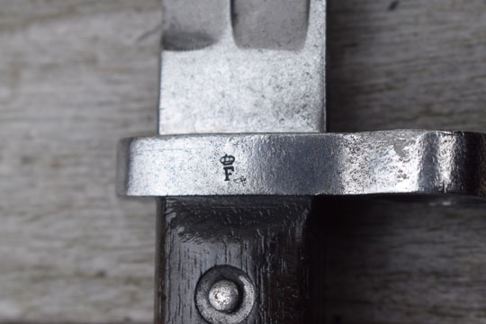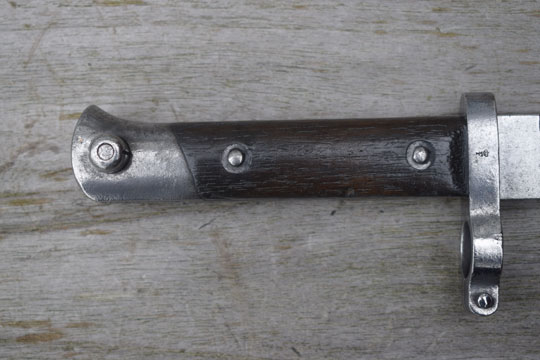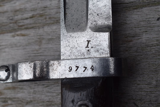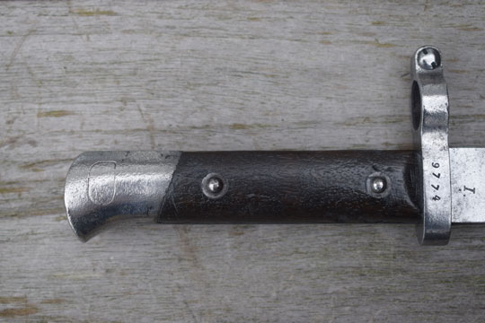 Mannlicher M 1888/90 rifle Cal. 8mm. Serial number: 9774 on the crossguard. Very good+ bright finished blade with square fullers. The blade is very very fine peppered only. Right ricasso is marked: I.. Bright finished pommel and crossguard with muzzle ring. MRD 16.5 mm and fastener on top. T-slot in the pommel. There is a crisp Bulgarian Crown over F (=King Ferdinant) marking on the left crossguard. Excellent wooden grips secured to the blade tang by two rivets. Blade tang upper is marked: BO