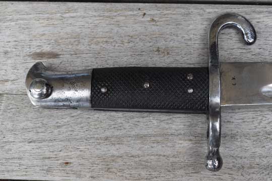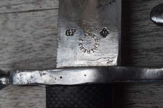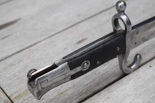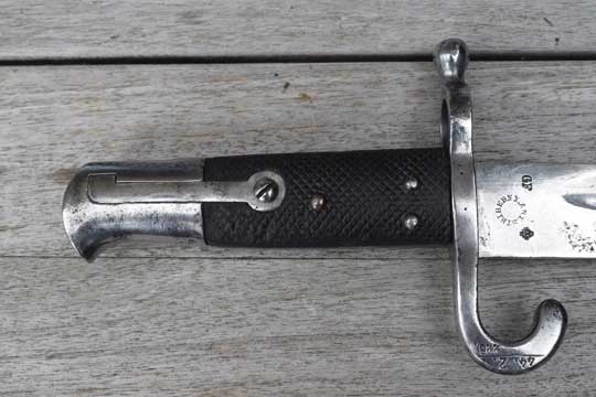Werndl M 1867 rifle. Excellent bright finished full length fullered yatagan blade with crisp Austrian crest and GF on the ricasso and the Austrian makers trademark and name: STRIBERNI.ANT. in a circle. (= Stanislaus Striberni- Vienna) Excellent bright finished pommel and crossguard with muzzle ring and large quillon. MRD 18.3 mm. Large round sight op top of the muzzle ring. Screwed on external spring and catch with large push button. Very crisp reg. marked: 44 Z over 228. (= 44th Infantry Regiment Erzhertog Albrecht, Budapest-Hungary. Weapon 228) on the quillon. Excellent checkered black leather grips fixed with four metal pins to the blade tang.