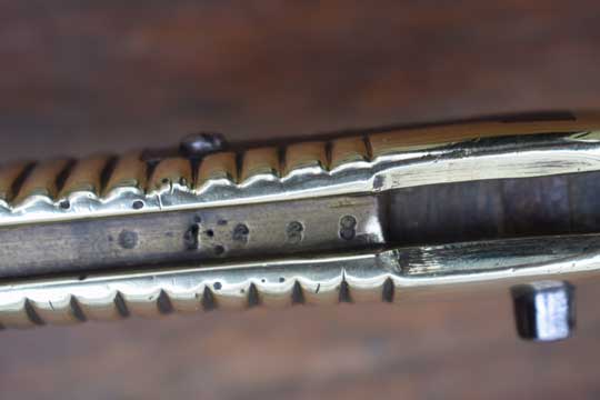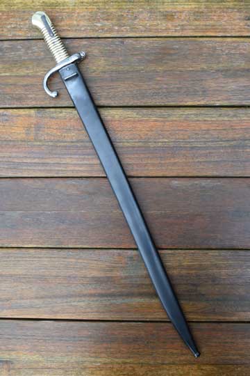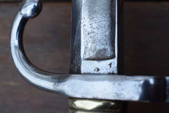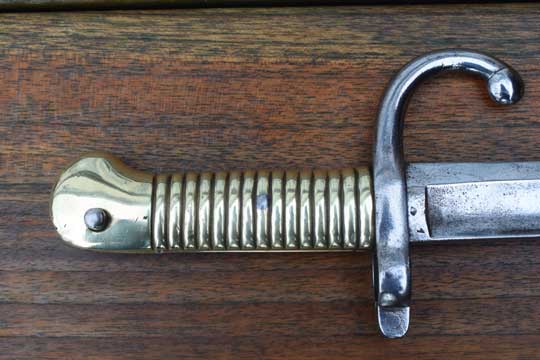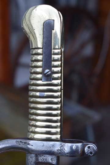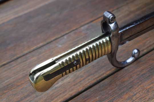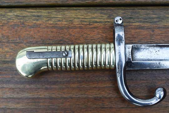 Belgian M1848-68 Jaeger Carbine. System Terssen / Belgian M 1870 Comblain rifle of the Civil Guard. Rifle number: 1668 in the mortise slot. Very good long fullered yatagan blade with typical Belgium marking: Crown over MD in a trilob followed by the year of production: 1869 on ricasso. P in a diamant shape and a number: 1 on the reverse side. The blade shows user spurs and some areas of very fine staining only. Excellent single piece brass hilt with much more rounded pommel then a Chassepot bayonet. External square spring fixed by a screw, Crossguard with muzzle ring MRD 17.1 mm and fastening screw on top. Slot is marked with a small C in a circle. Fast forward swept quillon with marking on the final : P in a diamant shape.