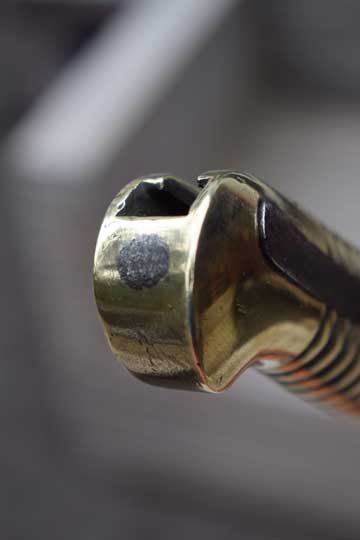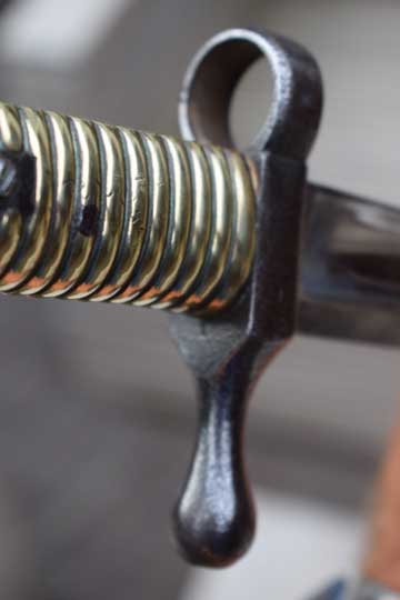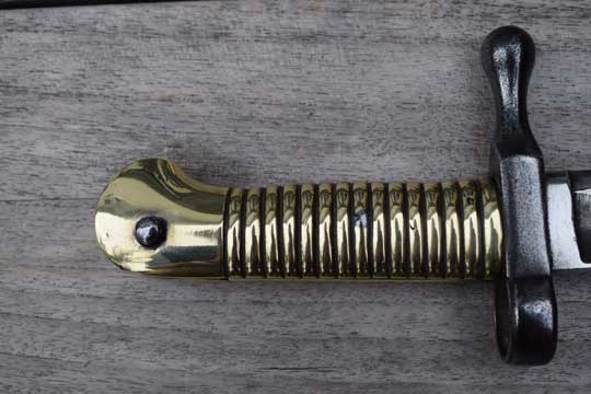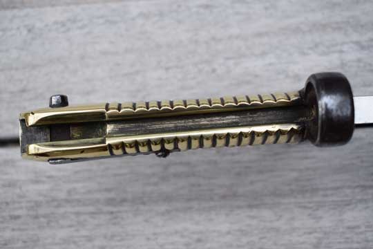 Belgian Thouvenin Jaeger carbine Kal. 17,5 mm. No serial number. Very good bright finished very long (739 mm) fullered straight blade. Blade shows very fine scratches allover only, due to incorrect cleaning, but there is no pitting!. Beautiful brass ribbed grip with a large pommel and an external leave spring. Excellent blued steel crossguard with a straight quillon marked J facing the grip.