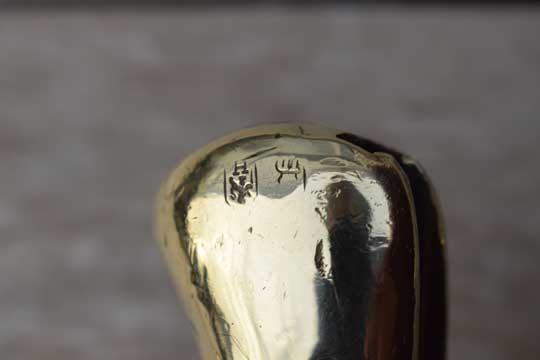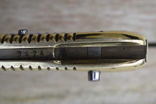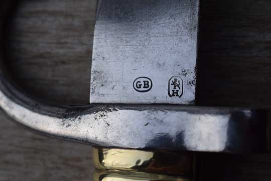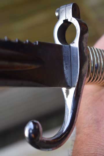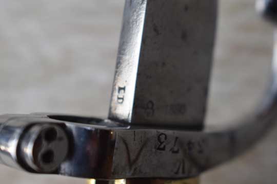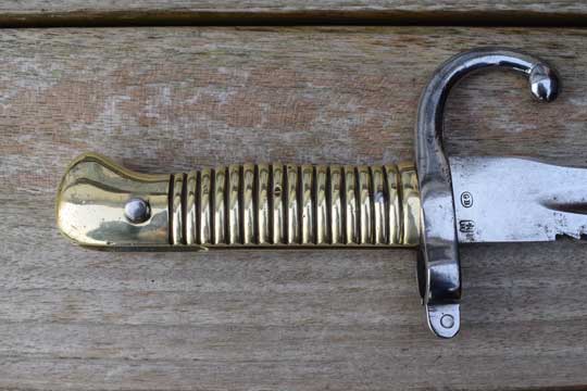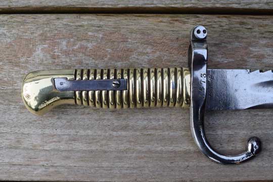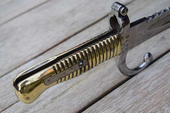 M 1777 - 1868 Terssen Engineer rifle. M 1880 Engineers bayonet. Serial number: 3474 in the mortise slot. Excellent bright finished fullered sawback blade with a large false edged. A very few small patches showing light peppering only. 31 pairs very sharp teeth. Ricasso shows early date: 1880 and a Belgian inspection mark: Crown over FA in a trilob. Reversed ricasso shows crisp a rampant lion over H in a box and GB in an oval. Blade spine is marked: LD. Excellent brass ribbed grip with an external spring marked: A in a box. Pommel is marked: rampant lion over H and Crown over NB in a trilob. Excellent bright finished steel crossguard with muzzle ring, MRD 17,2 mm, and a forward swept guillon. Left quilon is marked C in circle. Unit marked: V over 3473 on the crossguard.