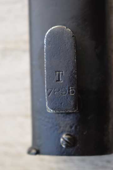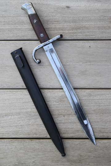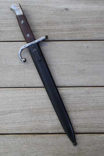 Belgian Mauser M 1889 rifle, rifle Cal. 7.65. Serial number: T 7295 Matching! on the left side of the crossguard. Excellent bright finished fullered mid length blade. (300 cm.) Tip of the blade shows some stains only. Belgium inspection marking: JB under a crown in a trilob on the ricasso and V in a box inspection mark on the blade spine. Bright finished pommel and crossguard with forward swept guillon, marked V in a box. Catch with a V mark in a box. Right crossguard is marked: E 2246 (= Home Guard District: E (= District Brussels). Muzzle ring MRD 17.5 mm. Excellent wooden grips secured by two screw bolts.