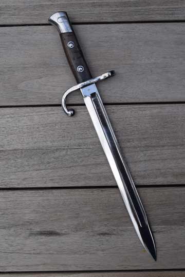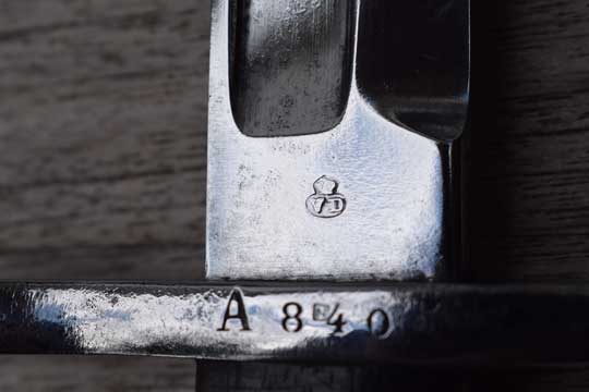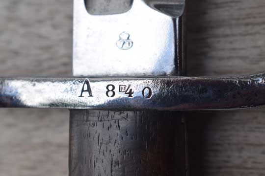Belgian Mauser M 1889 rifle, rifle Cal. 7.65. Serial number T 2846 on the left crossguard. Superb bright finished fullered mid length blade. (300 cm.) Belgium inspection marking: VD under a crown in a trilob on the ricasso and a tiny a in an oval on the reverse side. N in a box inspection mark on the blade spine. Bright finished pommel and crossguard with forward swept guillon, marked N in a box. Right crossguard is marked: Large A 840 (= Home Guard District: A = Antwerpen. Antwerp. ) and another crisp N in a box. Muzzle ring MRD 17.5 mm. There is some abuse to the blade tang in the grip and also to the top of the right grip only. Excellent wooden grips secured by two screw bolts.