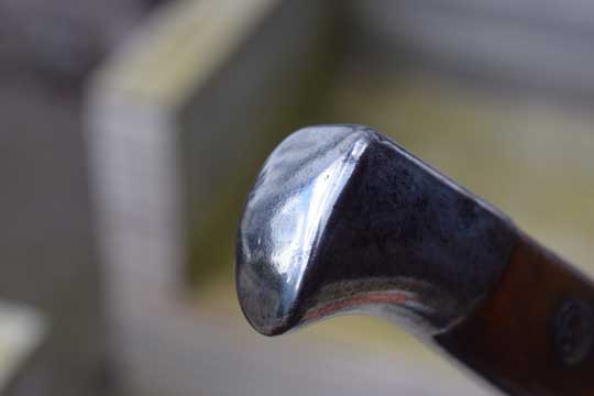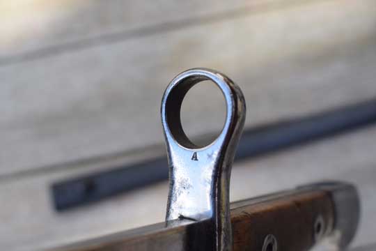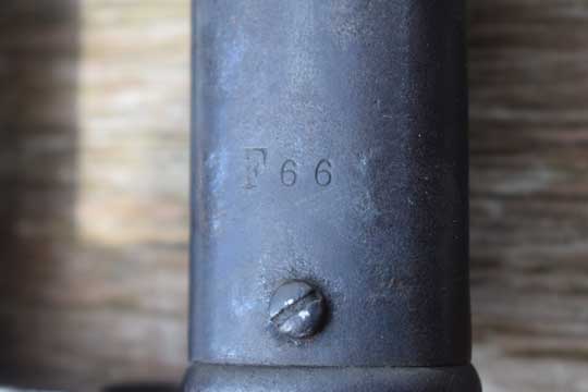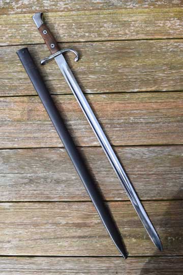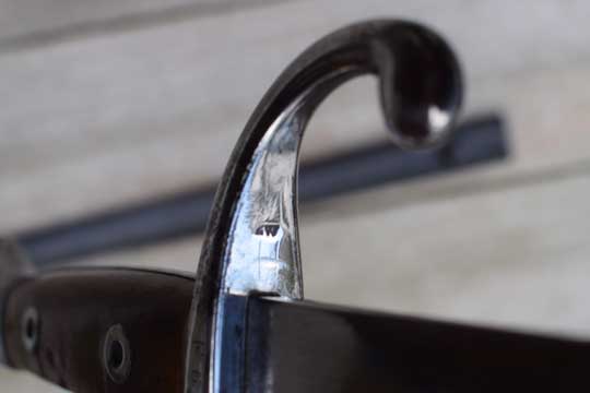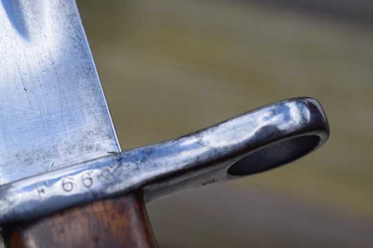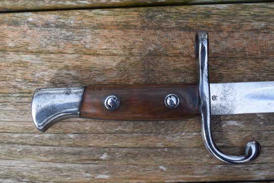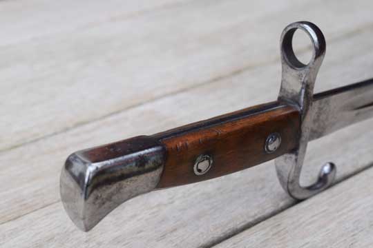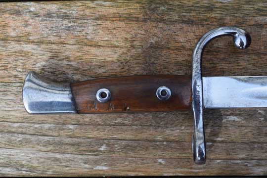Belgian M 1893 NCO bayonet without mortise slot and press catch. Serial number: F 66 Matching!. Beautiful very long bright finished fullered straight blade with a Belgium inspection mark on ricasso: Crown over JA in a trilob. Bright finished pommel without a mortise slot and press catch. Bright finished crossguard with serial number marked, facing the blade: A and ZW. Muzzle ring MRD 17,5 mm. and a forward swept quillon with final. This hilt is made out of one piece of steel. Excellent wooden grips secured to the tang by screw bolts and washers.