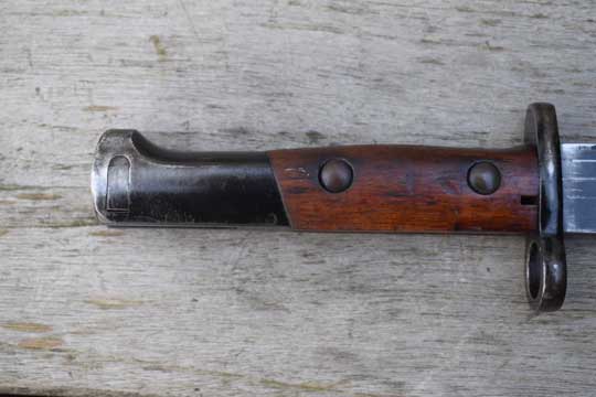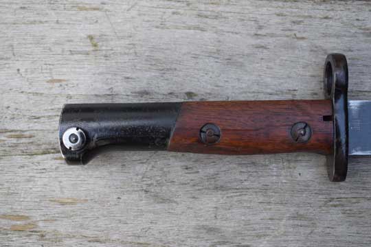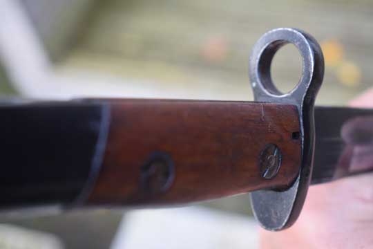 Belgian FN Mauser M24, 24/30, 1934. Kal. 30.06. Serial number: 6727 on the pommel. Excellent blackened long fullered blade, but much of the blackening is worn off only. Excellent darkened pommel and crossguard with muzzle ring. MRD 15,5 mm. Excellent wooden grips secured with screw bolts to the blade tang. Oil hole in grip.