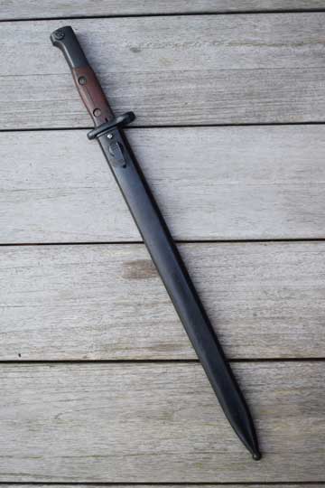 Belgian FN Mauser M24, 24/30, 1934. Kal. 30.06. Serial number: 16563 on the pommel. Superb long bright finished fullered blade. Deep blued pommel and crossguard with muzzle ring. MRD 15,5 mm. Excellent wooden grips secured with screw bolts to the blade tang. Oil hole in grip. Excellent deep blued scabbard with no serial number and no dents.
