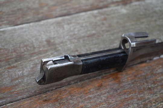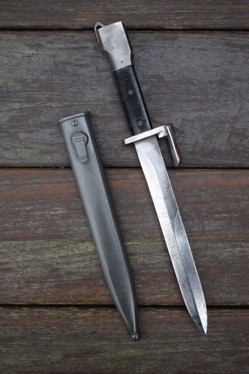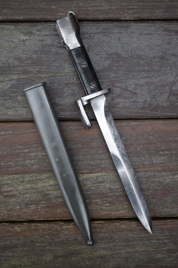 Belgian FN FAL rifle, 7.62 mm NATO. Very good+ bright finished somewhat stained blade with a large false edge. Excellent- black ribbed plastic grips secured to the blade tang with two screw bolts. Light abuse to the plastic grips only. Parkerized pommel and catch with small ring. Parkerized crossguard and a muzzle ring with a 2 prongs flash hider. MRD 15.5 mm. Excellent+ blackened scabbard with no dents.