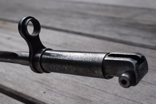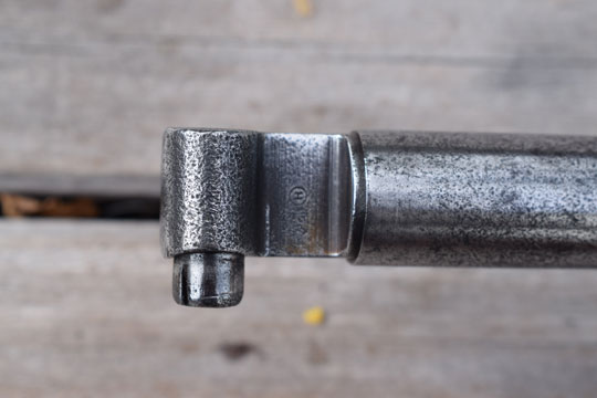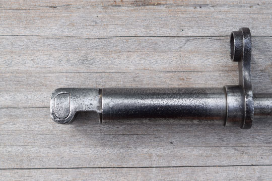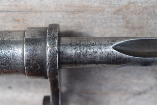 Belgian Mauser M 1935 and M 1936 rifle. No serial number. Excellent cruciform blade with circular ricasso, length 566 mm. Ricasso is marked with a H in a circle. Very good circular grip and crossguard with stepped back muzzle ring MRD 15,5 mm. H in a circle mark on pommel. Slot in pommel. Correct working release button. No scabbard. Bayonet grip is stained but there is absolute no pitting.