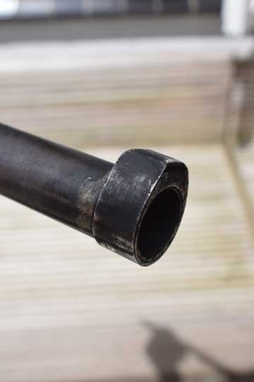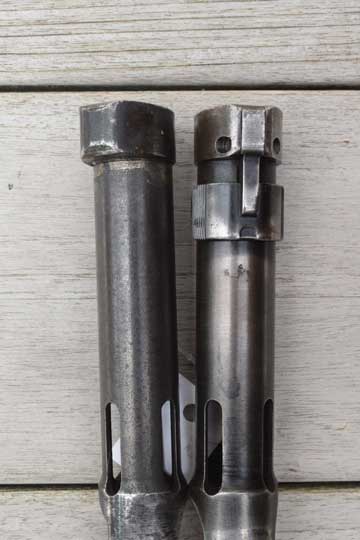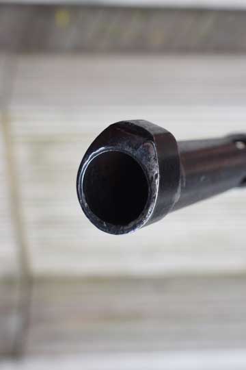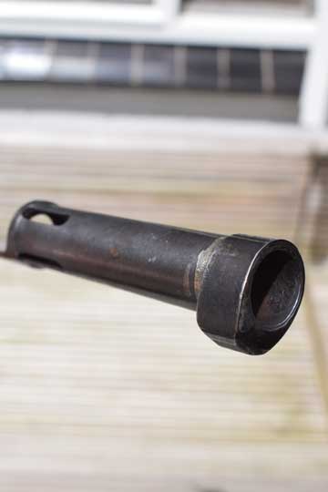 "FN FAL and CAL. automatic rifle". Production failure socket bayonet. A very rough unfinished blade with a flat upper side and a round underside. Clear file strokes to the blade. It has an Excellent long cylindrical socket made out of one piece with the four standard slotted openings, but it seems the welding of the rear side to the cylindrical socket failed during the production proces. The rear side was not correct fixed to the socked and therefor is must have been rejected from the production line. There is no provision for a slot made in the rear side at all.