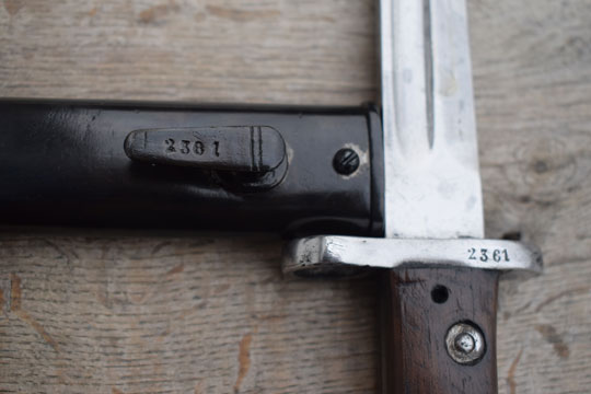 Brazilian Mauser Vergueiro M1904. Serial number 2361 Matching! on crossguard. Excellent bright finished fullered blade with no markings. Excellent bright polished pommel with T-O slot and crisp serial number on crossguard. Bright flush riveted crossguard with muzzle ring MRD 15,5 mm. Very good wooden grips secured to the blade tang with rivets. Cleaning hole in grip. Very good blued scabbard with no dents and matching serial number on frog stud.