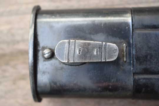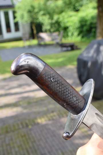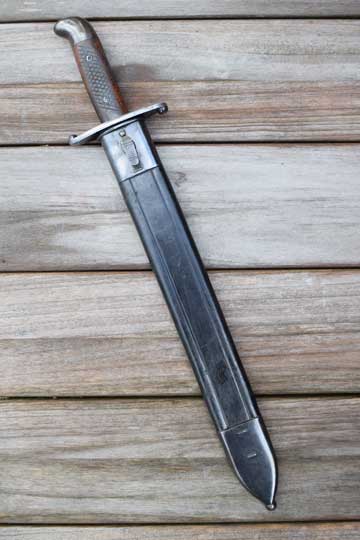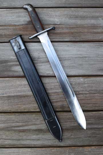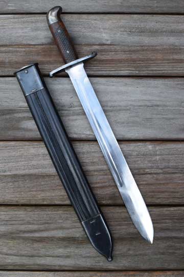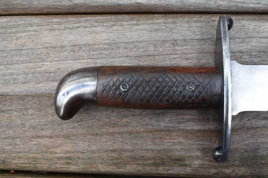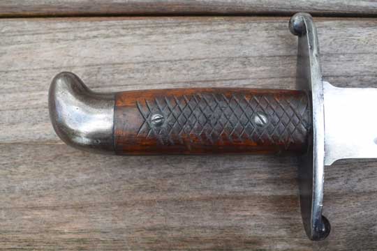 Brazilian M 1908 Artillery short sword. Excellent- heavy bright finished fullered blade with no markings. Large false edge. Blued hilt with a rounded pommel and a large crossguard. Excellent checkered wooden grips secured by two screw bolts. Excellent black leather scabbard with great tooling and all stitching intact. Stapled blued mounts without dents. Frog stud is maker marked: F I. (=Fabrica de Itajuba)