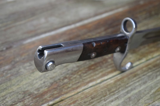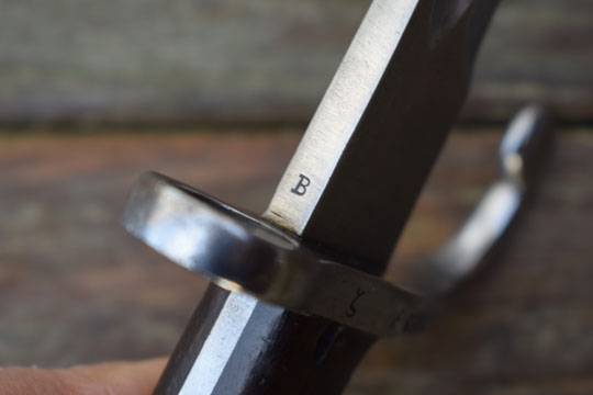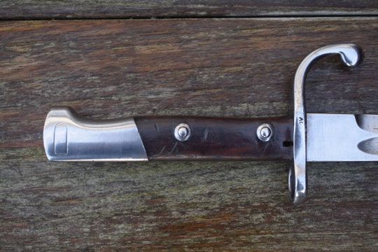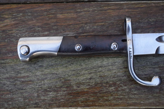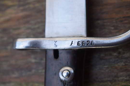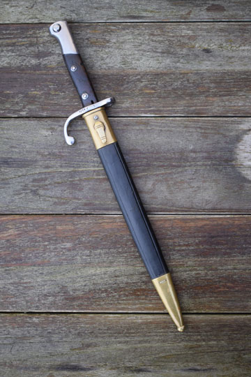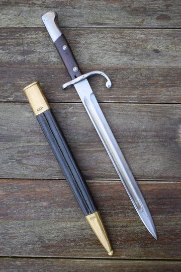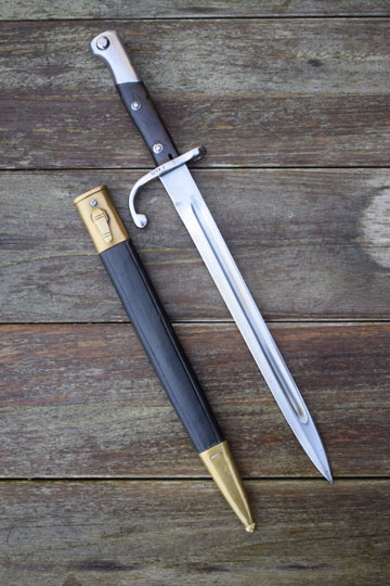 Brazilian Mauser M 1908 rifle. Serial number: ζ λ 6626 on the crossguard. Excellent bright finished fullered blade. Blade spine is marked B for Brazil. Excellent bright finished pommel with T-O slot and crossguard with quillon and muzlle ring. MRD 15,5 mm. Excellent wooden grips secured to the tang by rivets. Right grip is marked: 53.