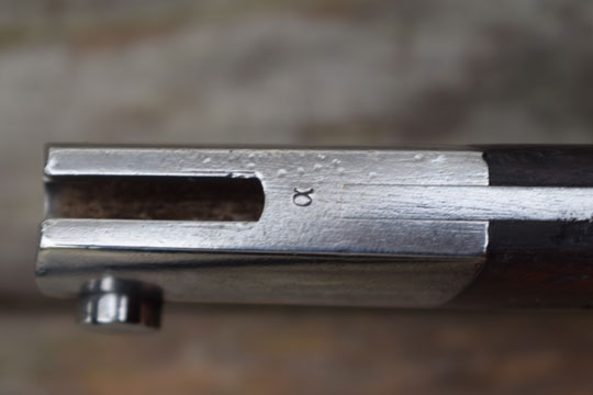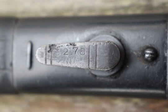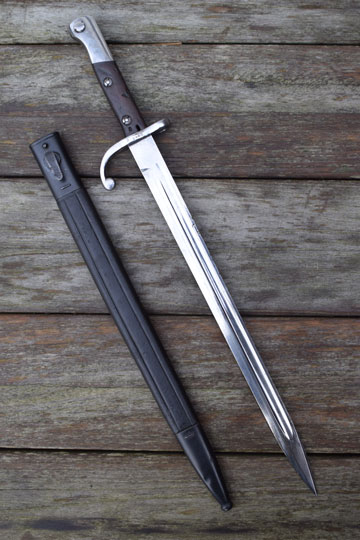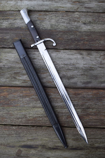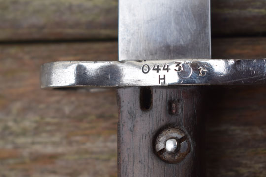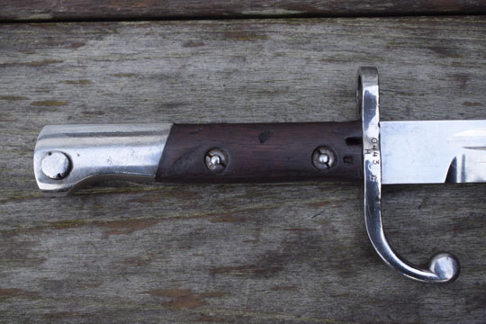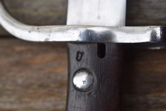Brazilian Mauser rifle M 1908-34. Serial number: 0443 over H and α on crossguard. Excellent bright finished long fullered blade with only a few pits to the blade spine. Ghotic script α on crossguard facing the blade and pommel near the mortise slot. No makers name, but we know that these were made in Germany. Bright finished polished pommel with T-O slot and crossguard with forward swept quillon and muzzle ring MRD 15,3 mm. Wooden grips secured to the blade tang by screw bolts. Bolts are marked; α. and both wooden scales: ß. Oil hole in grip.