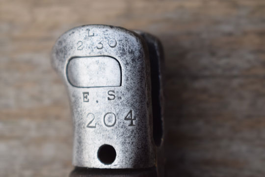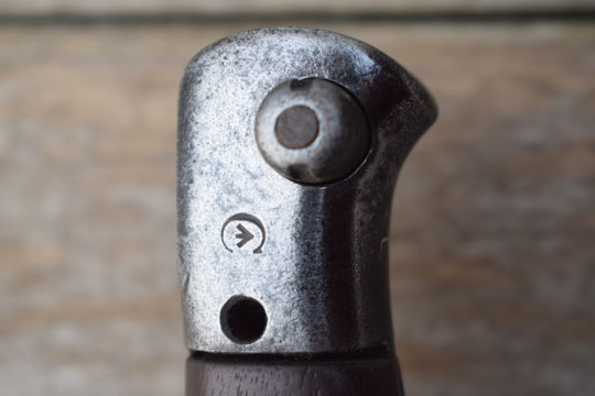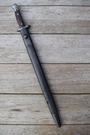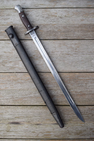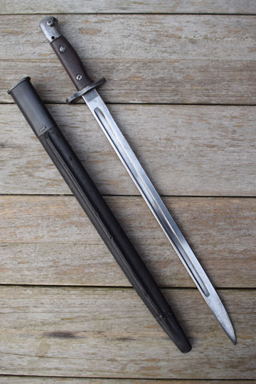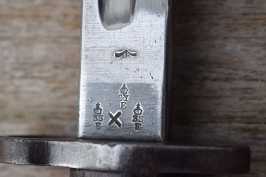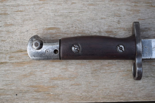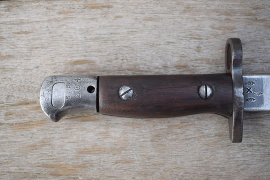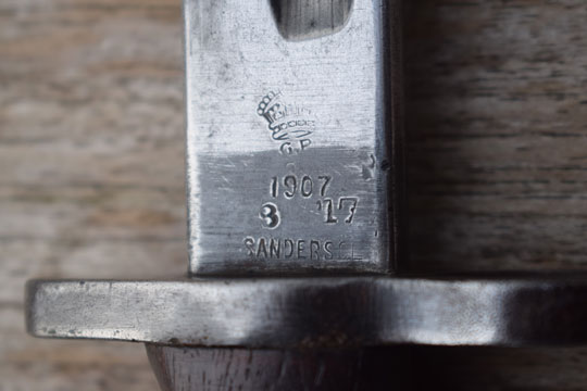 British Lee Enfield (SMLE) No7 rifle. Second pattern with an oil hole in pommel. Excellent bright finished fullered blade. First cm. blackened. Little field sharpening only. Ricasso is marked: Crown over GR over 1907 over date: 8 -'17 and the English maker's mark: SANDERSON (= Sanderson Bros & Newbould Ltd- Sheffield). /I\ and X and three Enfield inspection markings: 2 x Crown over 35 over E and Crown over CY over E on the reverse side. Crisp Canadian ownership mark: /I\ in a C, on the pommel and a unit marking on the reverse side: L. over 2. 30 over E. S. over 204. (= ?) Excellent walnut grips.