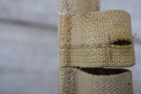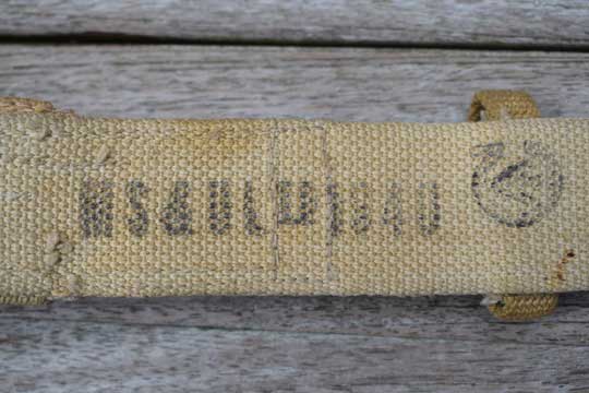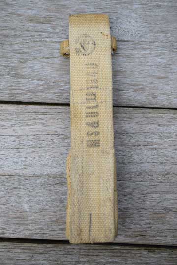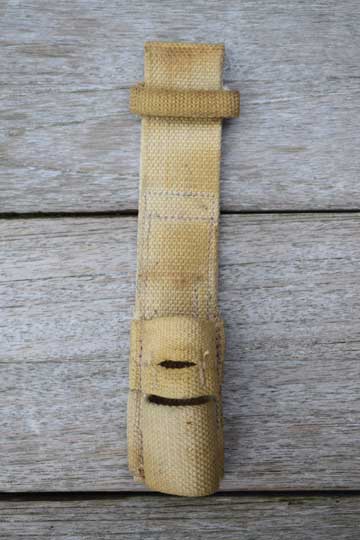 Canadian made Pattern 1937 Web Equipment Belt frog. Minty khaki P 1907 belt frog with three front loops. Two top loops sewed together to make an eyelet to fit the No.4 socket bayonet. Reverse side is stamped: M S & U Ltd 1940 and an Canadian ownership marking: C and /I\