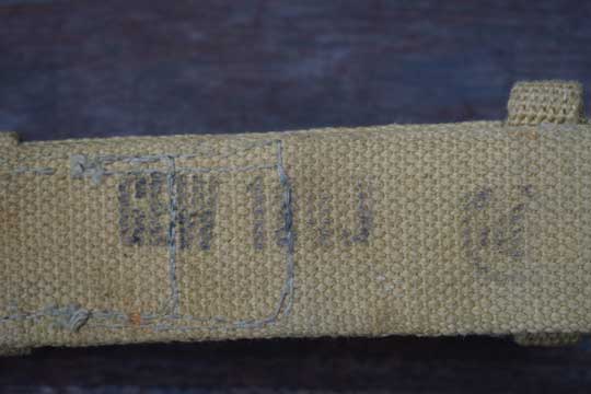 Canadian made Pattern 1937 Web Equipment Belt frog. Minty khaki P 1907 belt frog with three front loops. Two top loops sewed together to make an eyelet to fit the No.4 socket bayonet. Reverse side is stamped: GEW 1943 (=Granby Elastic Web Co Ltd -Granby-Quebec) and an Canadian ownership marking: C and /I\