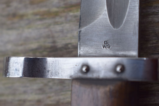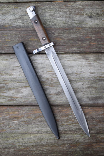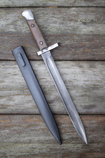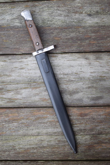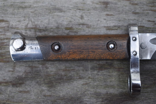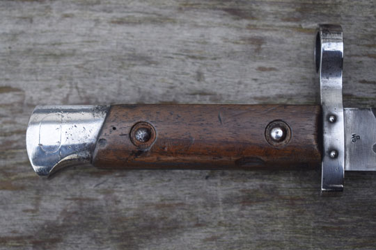 Mannlicher M 1895 rifle, cal. 8 x 50R. Excellent parkerized fullered blade. Cutting edge up. Czechoslovakian maker's trademark: ( "Yin & Yang sign") ZP in a circle (= Zbrojovka in Prague) on the ricasso. The Austrian blade makers trademark: OEWG is on the reverse side. Excellent bright finished pommel and crossguard with muzzle ring MRD 15 mm. Pommel is marked: Czech lion in a box /23.(= date: 1923) Rivets in crossguard. T-slot in pommel. Excellent wooden grips riveted to the blade tang.