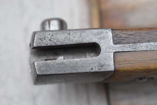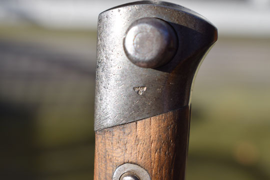Mannlicher M 1895 rifle, cal. 8 x 50R. Serial number: 10 in mortise slot Matching!. Excellent parkerized fullered blade. Cutting edge up. Czechoslovakian maker's trademark: ( "Yin & Yang sign")  ZP in a circle (= Zbrojovka in  Prague) on ricasso. Downside blade is marked: T.  Excellent bright finished pommel and crossguard with muzzle ring MRD 15 mm. Inside mortise slot is marked: 1O. Pommel is unusual marked with a very small but crisp Nazy stamp.  A single German eagle, a clear property mark and not a Waffenambt stamp!