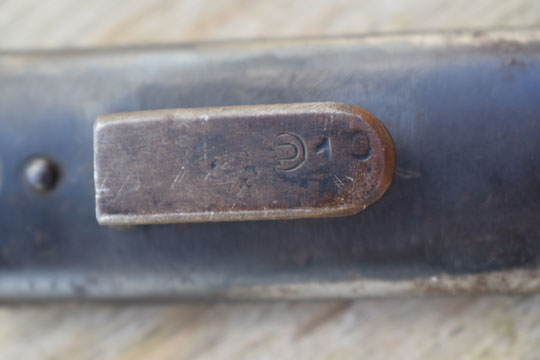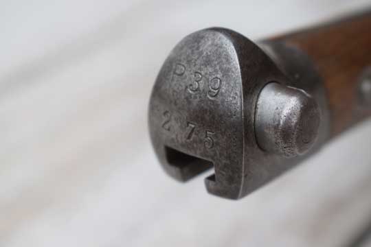 Top of the pommel is unit marked:  P 39 over 275.  Rivets in crossguard. Excellent wooden grips riveted to the blade tang.