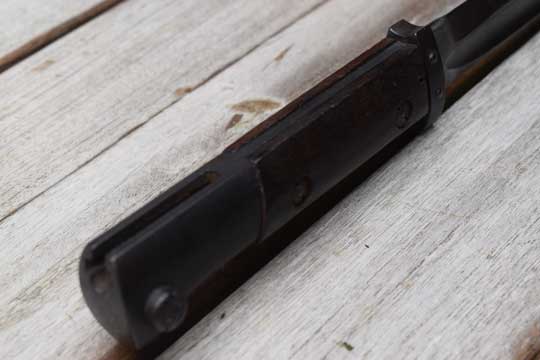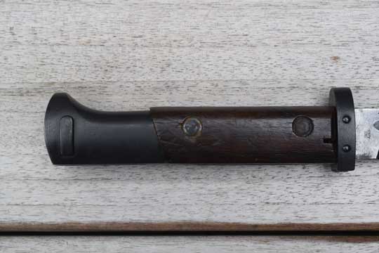 German G33/40 Mountain troops carbine and Czech VZ24 short rifle(G24(9t.). Excellent dark blued fullered blade with cutting edge up. Ricasso is marked with the logo of the Waffenfabrik Bystrica Werke: Z in a double circle. and a tiny German Waffenambt marking; German Eagle over A80 on the reverse side. Excellent blued pommel and crossguard, made without a muzzle ring. Crossguard is riveted to the blade tang. Excellent wooden grips affixed with screw bolts and an oil hole.