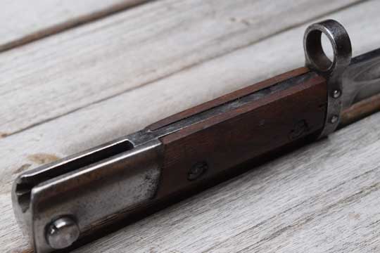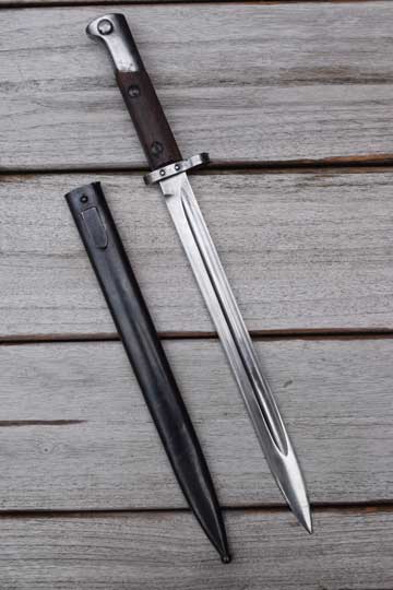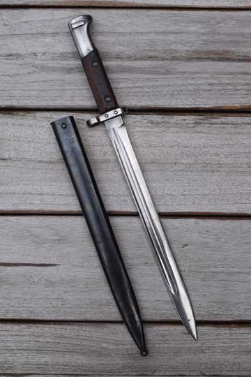 Czechoslovakian (BRNO) Mauser VZ24, 7.65 mm rifle. Serial number 01451 on pommel. Excellent bright finished fullered blade with no markings. Cutting edge downwards!