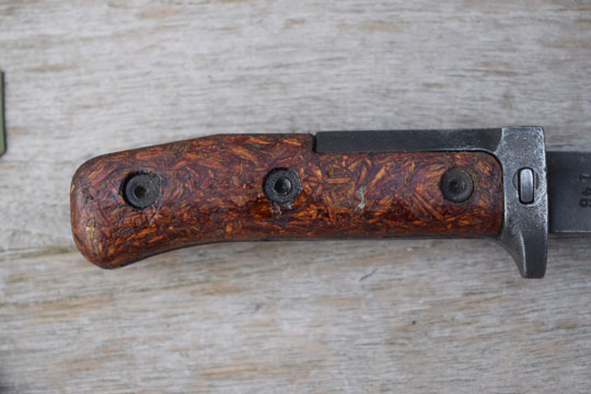This is the second model with a quillon and a short blade tang and three rivets of this interesting bayonet. This one comes in its green vinyl scabbard for use with the VZ–58 bayonet in nuclear, biological, and chemical (NBC) warfare environments. This special scabbard was necessary due to the difficulties encountered with decontaminating the absorbent all-leather scabbard, once exposed to toxic agents.