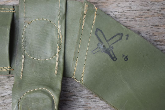 Minty green dfouble stitsched vinyl scabbard with integrated frog and retaining strap. The reverse side op the scabbard tip is ink stamped: Two crossed swords and 1976/1