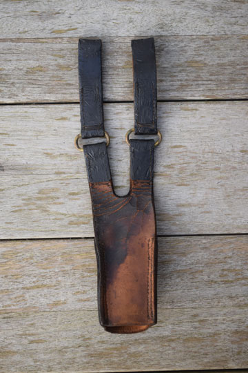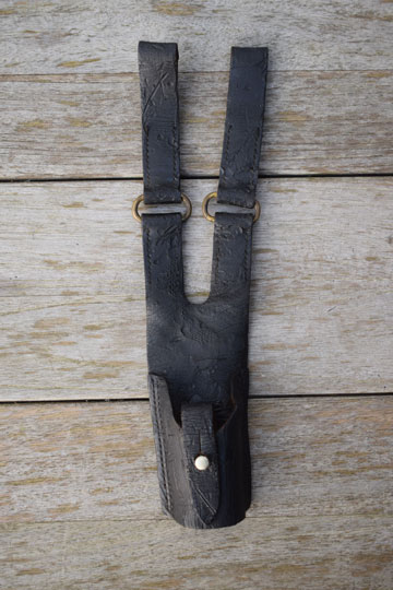 Danish bayonet frog Model 1910 for the M 1915 Karde bayonet. Black leather frog with two belt loops attached to brass rings and a white metal button was issued with the M 1915 karde bayonet and is thought to have been carried by dismounted cornets and corporals (Ref: AC 203)