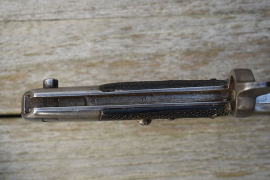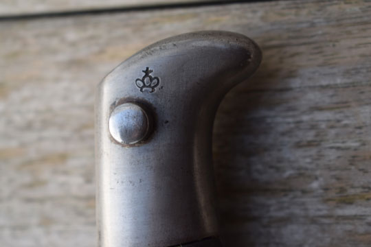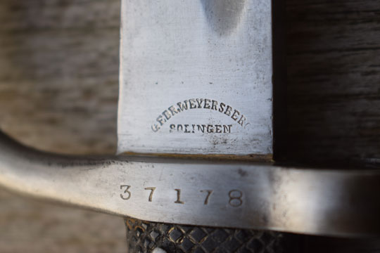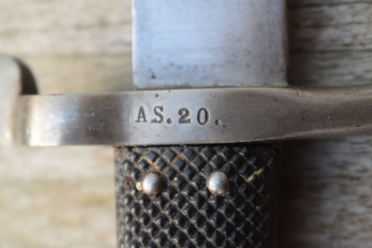 Remington Rolling Block rifle M 1867 and M 1867-96. First model. Serial number on crossguard: 37178. Minty bright finished yatagan blade. Blade spine is marked: Crown over W. German makers name on the left ricasso: GEBR. WEYERSBERG in an arch over SOLINGEN. Bright finished hilt and crossguard with muzzle ring MRD: 18.2 mm. and a swept forward quillon. Right crossguard is unit marked : A. S. 20. (=Artillery Staff. Rifle 20). Right grip with an external spring Excellent pressed black leather grips riveted to the blade tang by 4 steel rivets.