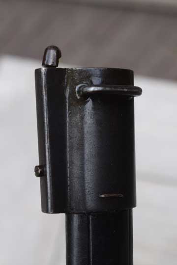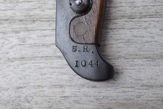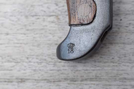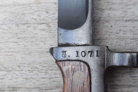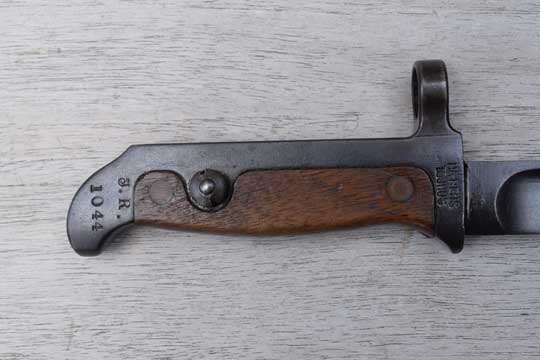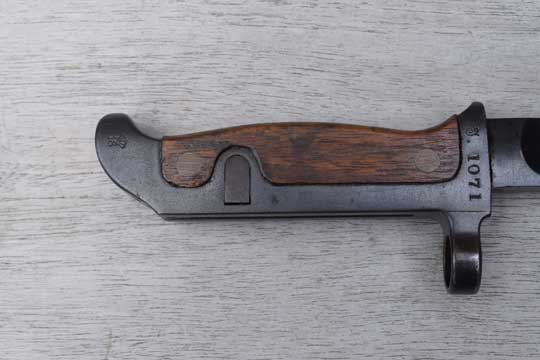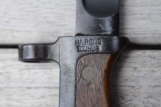 Danish M 1889 and M 1889-24 Krag Jorgensen rifle. Serial number on crossguard: J 1071. Minty dark blued long T-blade. (This is the scarce variation with the rounded fullers at the ricasso.) One piece blued steel grip with wooden scales riveted to the grip by two brass rivets.. Very long mortise T-shaped slot in the back of the hilt. Top of the hilt is Regimental marked: J. R. over 1044. The reverse side is marked: Crown over 18. Crossguard with muzzle ring is maker (Arsenal) marked on the right side: HAERENS TOJHUS. MRD 14,4 mm.
