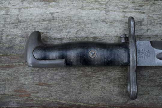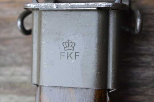Danish M 1950 M1 Garand rifle. Minty dark parkerized fullered short blade. Left ricasso is crisp marked Crown over FKF over 1955. Parkerized pommel and crossguard. MRD 15,5 mm. Black ribbed bakelite grips secured by a central screw. T-slot in pommel. Catch near the crossguard.