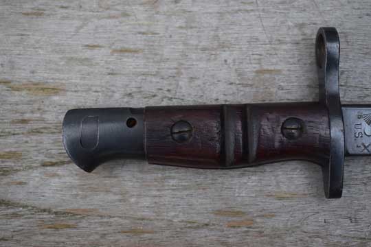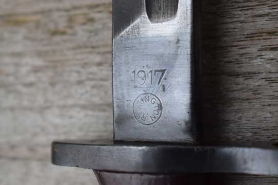 US M 1917 rifle. No serial number. Excellent WWII parkerized fullered blade with US maker's name: Remington in a circle and 1917 on the ricasso. First 2.5 cm are blackened .US flaming bomb, X mark and Eagle head over 25 on reverse side. Excellent+ dark blued pommel and crossguard. Excellent ++ walnut wooden gips with two notches fixed to the blade tang by screw bolts. NATO green painted leather scabbard is marked GF in an oval to the mounts. Also the fittings are painted NATO green.