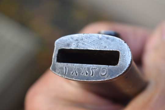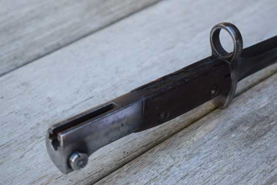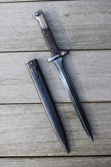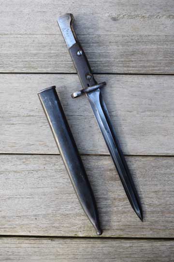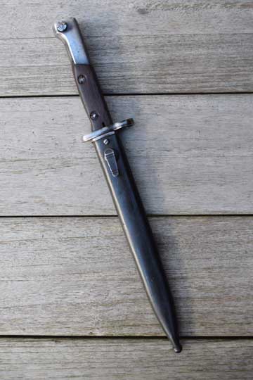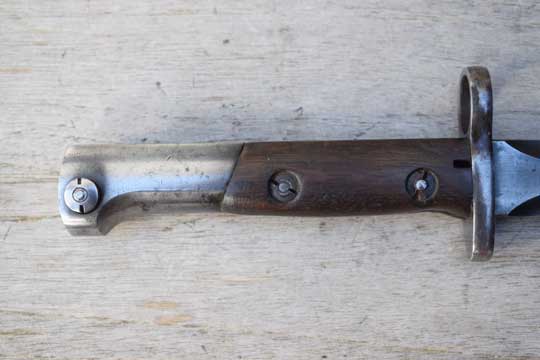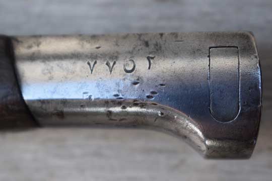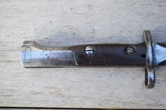 FN 49 ABL and SAFN 30 cal. 30-06. Serial number: in Arabic on left side of the pommel. Excellent parkerized double edged blade with a central rib. Excellent blued pommel with T-O slot and crossguard with muzzle ring. MRD 18 mm. Pommel is marked with Arabic serial number. Oil hole in grip. Dark wooden grips secured to the tang by screw bolts.