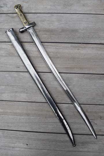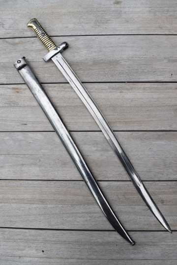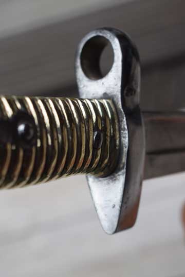 This is a very interesting modification of a Egyptian Remington M 1870 bayonet by replacing the total crossguard to fit the Egyptian Martini Enfield .303 rifle. This model is called M 1914 and was used by the Egyptian police.