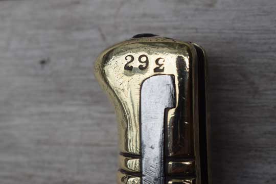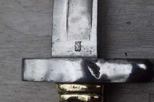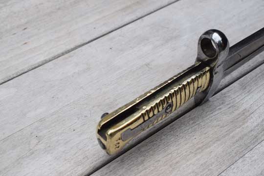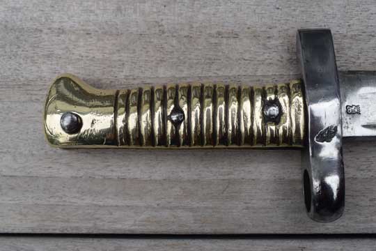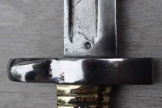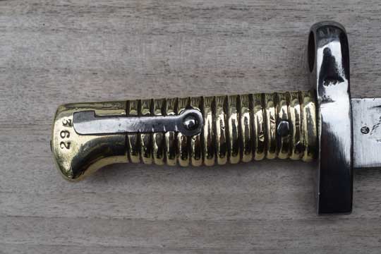 Egyptian Martini Enfield rifle .303. Police number: 293. Excellent bright finished fullered yataghan blade with German maker's trade mark: Crowned Kingshead (= Weyersberg-Solingen) on ricasso. Reverse side marked with a W in a circle. Excellent brass ribbed hilt with external spring fixed by a rivet. Right side of the pommel is numbered :293. Typical chamfered Remington slot. Crossguard is replaced by a very thick and massive one without a quillon. The muzzle ring is placed higher, has a smaller diameter. (MRD 16.5 mm).