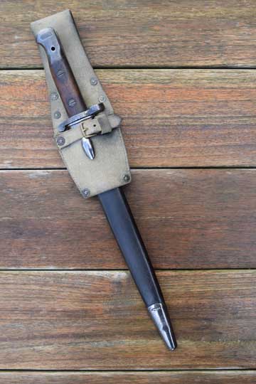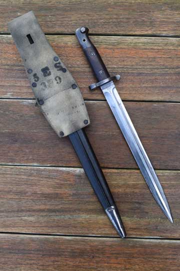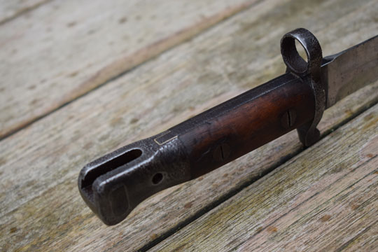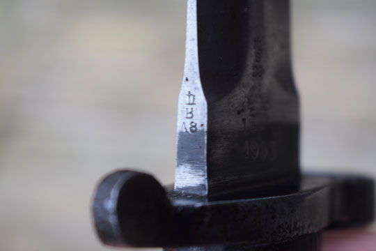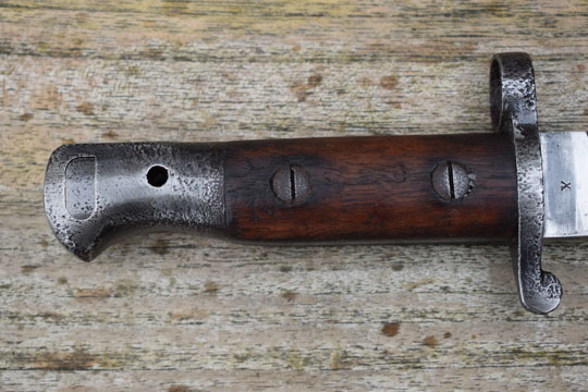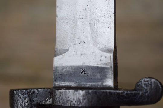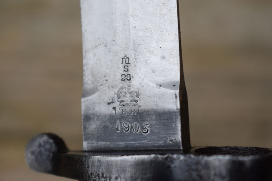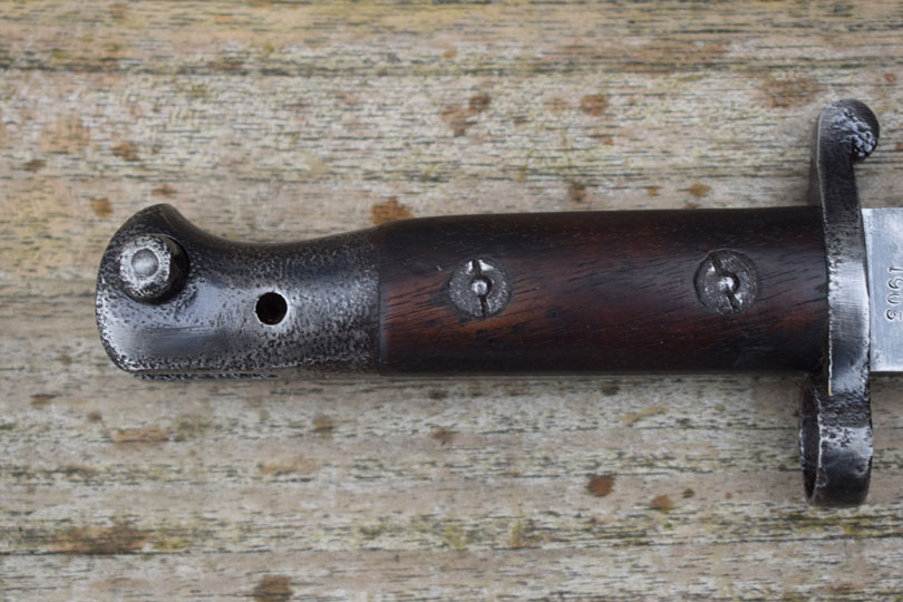 British SMLE .303 rifle. Excellent bright finished double edged blade with a central rib. The first cm is blackened. Crown over ER (Edward Rex) 1903 and Sheffield inspection marking very crisp on the ricasso. The reverse side is marked /I\, and a bending mark: X. Blade spine is marked with two Sheffield inspection markings. Opposite is marked with a Birmingham inspection marking. Very nice blued pommel with oil hole and blued crossquard with muzzle ring. MRD 16.5 mm. Pommel and crossguard are showing spots of peppering to light pitting only. Excellent wooden grips secured by two screws bolts. The right grip is marked with an inspection stamp.