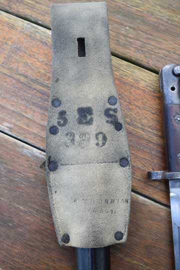 Comes with its Excellent and genuine Slade Wallace buff leather (1889) General Service MKII belt frog with brass rivets and a a brass buckle, unit marked and makers name stencilled on the back: 5 E S over 339 (= Royal Engineers) by E.THORNTON over ....1911 (AC81)