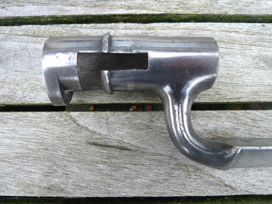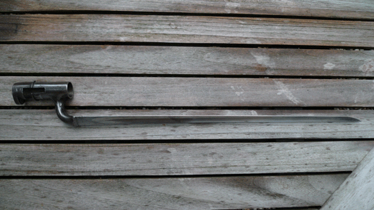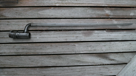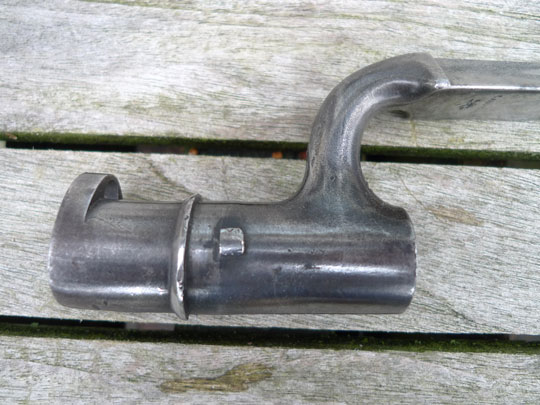 Modified for movie purpose. Socket of the blade is opened over the full length to allow the bayonet to be fixed on a large bore barrel. No locking ring.