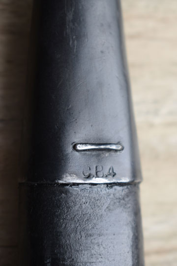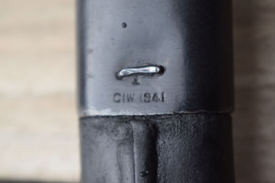 Excellent black leather scabbard with a blackened top mount and chape. Leather body with a large W. Top mount is marked: 238 and CIW 1941 and chape C.E.4 . Throat is marked: 1444. Both fittings have no dents. Round frog stud with three rivets to the top mount and all stitches intact.