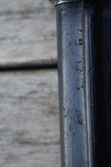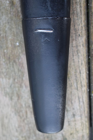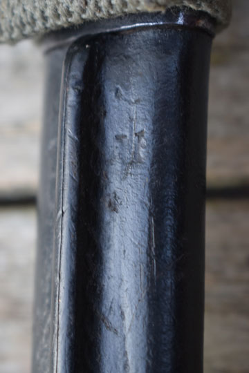 Excellent black leather scabbard with a blackened top mount and chape. Both are marked: /I\ and have no dents. Leather body is marked: WSC and /I\ and a large N for Navy use. Round frog stud with three rivets to the top mount and all stitches intact.