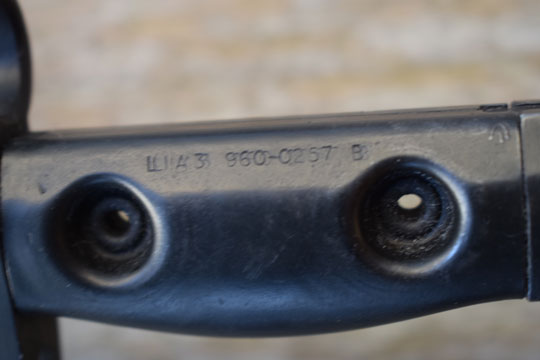 SLR. Semi-automatic rifle L1A1 Cal. 7.62 . Excellent parkerized fullered Bowie type blade with long fuller. British maker marking: B and 60 (=BSA 1960) on the ricasso. Blackened pommel is brazed to the tang and marked: /|\ B. T- type mortise slot. L1A1 type crossguard with muzzle ring MRD 14.8. Blackened metal grips are both marked /|\ and are riveted to the tang. Both grips are NATO code marked: L1A3 960-0257 B (B = made by BSA - Birmingham Small Arms.)