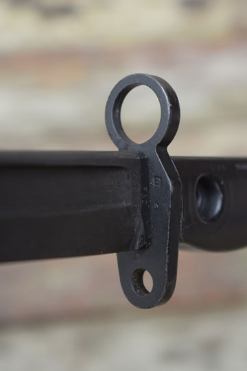 SLR, Semi-automatic rifle L1A1 Cal. 7.62. First model. Minty parkerized fullered Bowie type blade. First 1. cm blackened. Ricasso is marked: F 60 and 36 (=?) Blackened pommel with two small inspection stamps and a /I\. T- type mortise slot. First model crossguard with muzzle ring MRD 14.8 mm. Ð and C marking on the crossguard facing the blade.