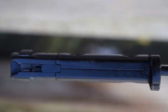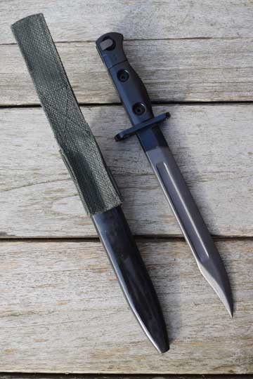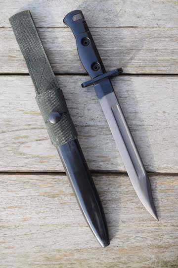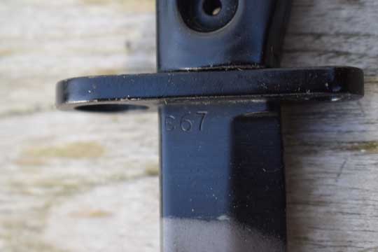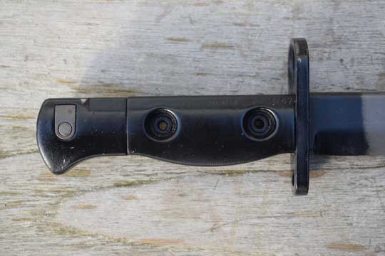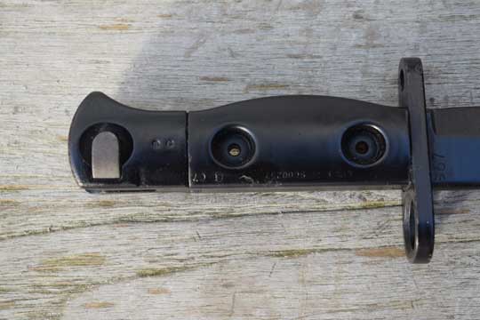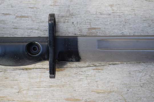 Semi-automatic rifle L1A1 Cal. 7.62 No s#. Second model. Minty fullered parkerized Bowie type blade with a short fuller. First 2 cm blackened. Enfield marking: Ð69 (= Enfield 1969) on ricasso. Blackened pommel with T- type mortise slot. Straight type crossguard with muzzle ring MRD 14.8 mm. Black metal grips are riveted to the tang by two hollow rivets. Both grips are NATO code marked: L1A3 9600257 Ð69 (= made at ENFIELD).