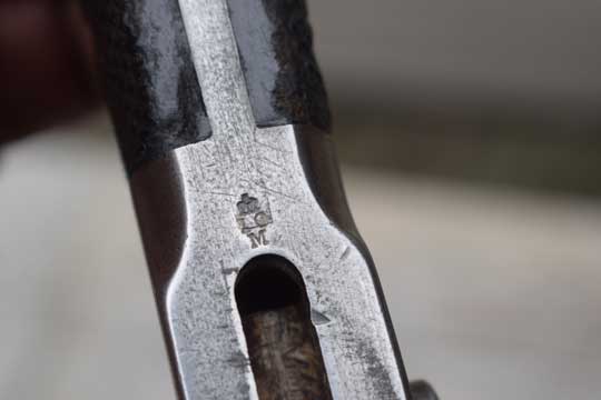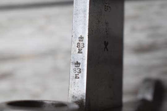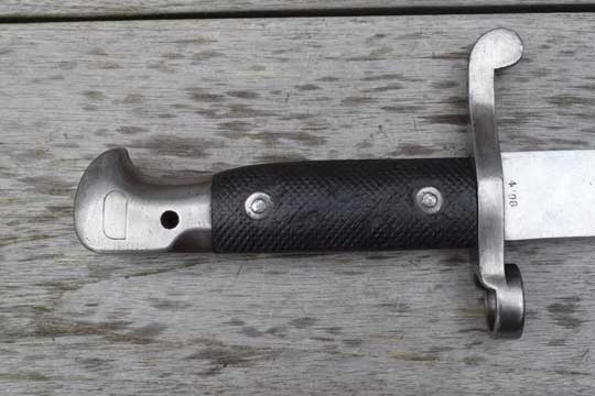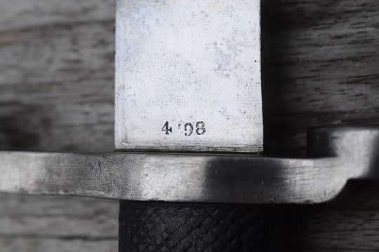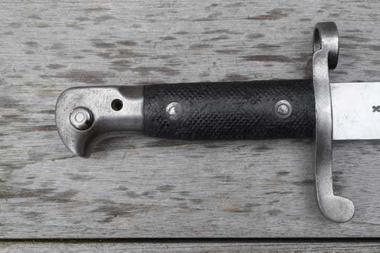 Martini Henry M 1887 rifle. Superb bright finished plain blade. Dated: 4 '98 on ricasso. Reverse side is stamped with: /I\ over EFD (= ENFIELD Maker), WD, and an Enfield inspection mark: Crown over 58 over E and X. Blade spine with two more crisp Enfield inspection marking: Crown over 83 over E. Excellent bright T- slotted pommel and crossguard with stepped muzzle ring (MRD 17,7 mm) and quillon. Slot is marked: Crown over 10 over M. Oil hole in pommel. Excellent checkered black composite grips fixed to the blade tang by two rivets showing very little wear only.