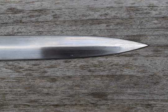 Excellent black leather scabbard with a serial number on the frog stud: 328 over E-M and /I\. No dents to the bright finished fittings. All stitches intact.