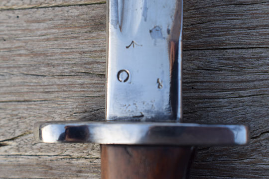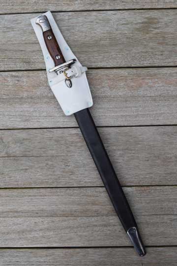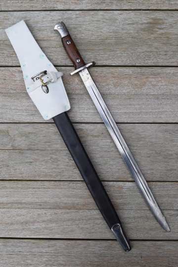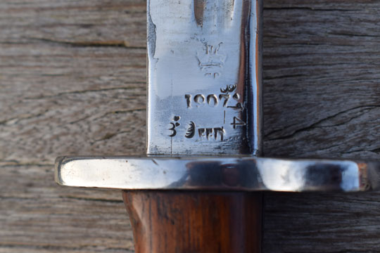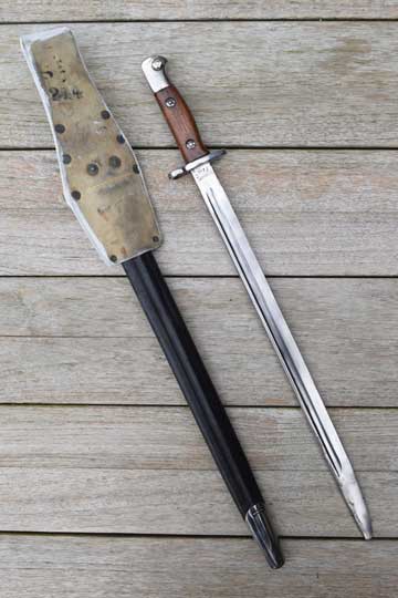 Comes with its rare modified General Service MKII frog, modified in 1914 to fit the P 1907 bayonet by adding a leather insert. The frog was blancoed for dress purpose and is marked on the reserve side: C over 240. (AC 93)