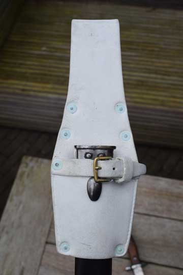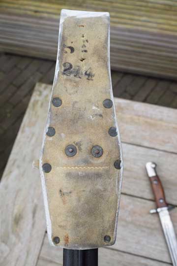 Excellent black leather scabbard with Enfield marking on the top mount and RE stamp ( = Remington ) on the chape. Teardrop frog stud and three rivets in the top mount. No dents to the bright polished mounts. Excellent Leather body is marked and dated: H.G.R.'09 and /I\ EFD and two Enfield inspection markings.